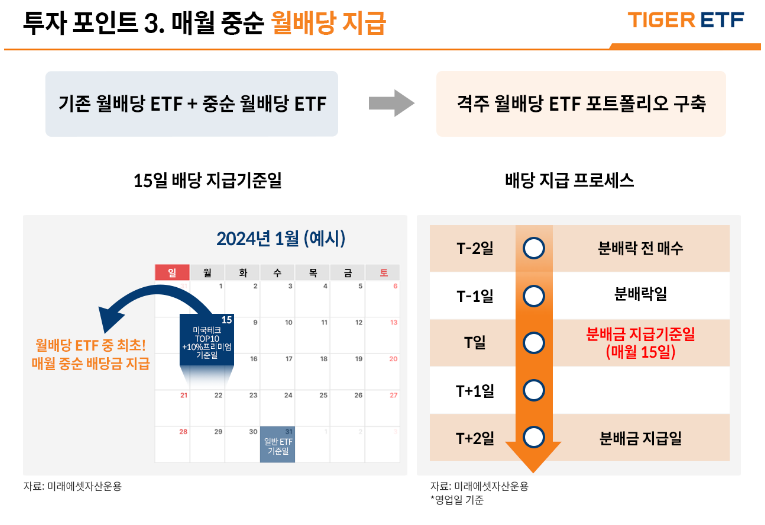 Tiger미국테크 Top10+10% 프리미엄 ETF는 국내 상장 ETF 중 처음으로 매월 중순에 배당을 지급합니다. 매월 15일(T일)보다 2일 전(T-2)에 매수할 경우 15일 보다 2일 후(T+2)에 분배금을 받을 수 있는 거죠.