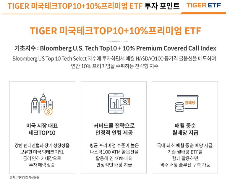 상장일 : 2024년 1월 16일 상장 한 Tiger 미국테크 Top10+10% 프리미엄 ETF해당 ETF는 1월 16일 상장을 하였습니다. 성장주의 대표주자인 "미국테크 TOP10"과 안정적인 인컴을 확보하는 "+10% 프리미엄", 두 가지 키워드가 투자자들의 주목을 집중시켰습니다. 어떤 투자 매력도가 있는지 보겠습니다.