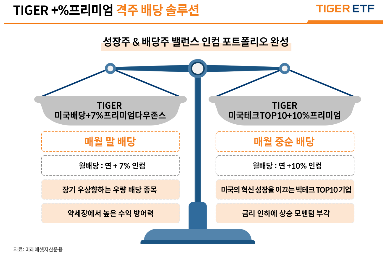 Tiger미국테크Top10+10%프리미엄 ETF의 장점은 성장과 배당 동시에 투자할 수 있는 ETF 상품이며, 높은 배당률을 자랑합니다. 월배당과 함께 배당 기준일이 15일이기에 타 ETF와의 차별점이 있어, 투자 전략을 새롭게 구상할 수 있다는 장점이 있습니다.